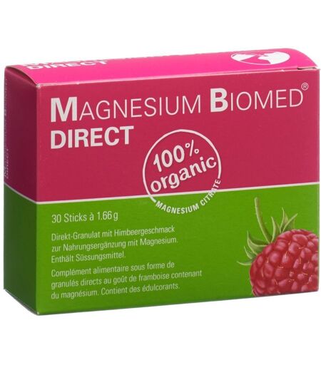 Nahrungsergänzungsmittel sind kein Ersatz für eine abwechslungsreiche und ausgewogene Ernährung und eine gesunde Lebensweise. Magnesium Biomed®DIRECT Das Magnesium zur direkten Einnahme Enthält 150 mg Magnesium pro Stick 100 % organisches Magnesiumcitrat Direkt-Granulat zum Einnehmen ohne Wasser Praktisch für unterwegs Mit natürlichem Himbeeraroma Geeignet für Vegetarier:innen und Veganer:innen Packungen à 30 und 60 Sticks Erhältlich in allen Apotheken und Drogerien Zutaten: Magnesiumcitrat, Süssungsmittel (Sorbit, Aspartam), Säuerungsmittel (Citronensäure), Randensaft-Pulver, Verdickungsmittel (Natriumcarboxymethylcellulose), natürliches Himbeeraroma, Aroma, Trennmittel (Talkum, Magnesiumsalze der Speisefettsäuren). Nährwerttabelle Nährwertangabe pro 100 g Pulver NRV pro 2 Sticks* Magnesium 300 mg 80 % *Tägliche Referenzmenge für Erwachsene Verzehrempfehlung: Kinder ab 7 Jahren: 1 x täglich 1 Stick Erwachsene und Jugendliche ab 13 Jahren: 1-2 x täglich 1 Stick Den Inhalt eines Sticks direkt auf die Zunge geben, zergehen lassen und schlucken. Empfohlene Tagesdosis nicht überschreiten. Hinweise: Mit Süssungsmitteln. Enthält eine Phenylalaninquelle.Kann abführend wirken. Nahrungsergänzungsmittel sind kein Ersatz für eine abwechslungsreiche und ausgewogene Ernährung und eine gesunde Lebensweise. Nettofüllmenge: 30 Sticks a 1,66 g Hersteller: Biomed AG Überlandstrasse 199 8600 Dübendorf ...