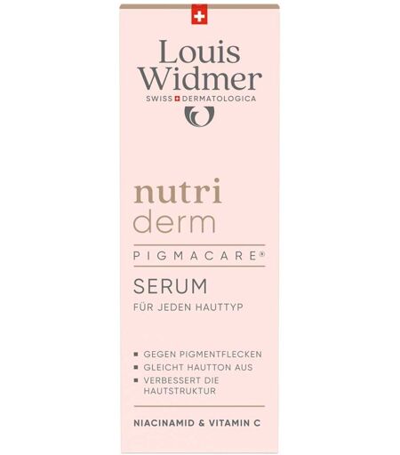 Anwendungsgebiet von Louis Widmer nutriderm Pigmacare® Serum Louis Widmer nutriderm Pigmacare® Serum ist ein ausgleichendes Serum mit Niacinamid und Vitamin C gegen Pigmentflecken für ein ebenmässiges Hautbild.Wirkungsweise von Louis Widmer nutriderm Pigmacare® Serum Louis Widmer nutriderm Pigmacare® Serum reduziert bei einer kurmässigen Anwendung über acht Wochen wirkungsvoll Pigmentflecken. Die Hautaufhellung ist signifikant. Die Rötung und die Tönung der Haut nimmt ab und der Hautton gleicht sich dadurch aus. Vitamin B3 gleicht Pigmentstörungen aus, hellt den Hautton auf, reduziert die Faltenbildung und verbessert die Hauterneuerungsrate. Vitamin C ist ein hautaufhellender Wirkstoff und wirkt somit gegen Pigmentflecken, reduziert Falten und durch UV-Strahlung ausgelöste Hautreizungen, Rötungen und Schäden. Zudem sorgt er für die Erhöhung der Elastizität durch Aufbau der Kollagensynthese in tieferen Hautschichten und verjüngert das Erscheinungsbild der Haut. Antioxidantien gleichen die Hyperpigmentierung aus, mindern Altersflecken und hormonell bedingte Pigmentstörungen. Sie reduzieren die Melanin-Produktion, gleichen den Hautton aus und sorgen so für eine strahlendere, ebenmässigere Haut.Wirkstoffe / Inhaltsstoffe / ZutatenLouis Widmer nutriderm Pigmacare® Serum enthält:Aqua, Coco-Caprylate/Caprate, Niacinamid, Dimethicone, Butylene Glycol, Cetearyl Isononanoate, Isopropyl Lauroyl Sarcosinate, Glycerin, Silica, PEG/PPG-18/18 Dimethicone, Titanium Dioxide, Caprylic/Capric Triglyceride, Propylene Glycol, Tocopheryl Acetate, Arginine, Hexylresorcinol, Resveratrol, Glycyrrhetinic Acid, Papain, Tetrapeptide-30, Ascorbyl Glucoside, Tocopherol, Hydrogenated Olive Oil Unsaponifiables, Ethyl Linoleate, Cetearyl Dimethicone Crosspolymer, Cetearyl Olivate, Potassium Cetyl Phosphate, Sorbitan Olivate, Acrylates/C10-30 Alkyl Acrylate Crosspolymer, Hydroxyethylcellulose, Xanthan Gum, 1,2-Hexanediol, Caprylyl Glycol, Carbomer, Algin, Disodium EDTA, Phe ...