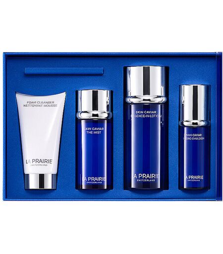 La Prairie präsentiert die ideale Sommerpflege – vereint in einem exklusiven Set. Entdecken Sie die vier Hautpflege-Essentials für Ihre perfekte Sommer-Routine: der Foam Cleanser, das Skin Caviar The Mist, die Skin Caviar Essence-in-Lotion und die Skin Caviar Hydro Emulsion. Alle Produkte sind in praktischen Reisegrößen im Set enthalten - perfekt, um Ihre Haut auch unterwegs sanft zu reinigen, zu festigen und zu erfrischen. Das Set beinhaltet: Foam Cleanser – 50 ml : Ein sanfter, wasseraktivierter Reinigungsschaum, der Make-up und Unreinheiten gründlich entfernt - für ein erfrischtes und perfekt gereinigtes Hautgefühl. Skin Caviar The Mist – 50 ml: Der perfekte Reisebegleiter, der die Haut jederzeit erfrischt, glättet und mit neuer Energie versorgt. Skin Caviar Essence-in-Lotion – 80 ml: Die feuchtigkeitsspendende Pre-Serum-Pflege unterstützt langfristig die Festigkeit der Haut und bereitet sie optimal auf die Aufnahme der leistungsstarken Kaviar-Inhaltsstoffe vor. Skin Caviar Hydro Emulsion – 30 ml: Die seidig-leichte Emulsion stärkt gezielt die Struktur der Epidermis, versorgt die Haut intensiv und langanhaltend mit Feuchtigkeit und mildert sichtbar feine Linien und Fältchen. Hauttypen: Alle Hauttypen, trockene Haut, Mischhaut, Normale Haut Anwendung: Reinigen Sie Ihre Haut zunächst mit dem zarten Foam Cleanser und tragen Sie anschließend Skin Caviar The Mist auf - für einen erfrischten und vitalisierten Teint. Verwenden Sie anschließend die Skin Caviar Essence-in-Lotion und die Skin Caviar Hydro Emulsion, um die Haut intensiv mit Feuchtigkeit zu versorgen und ihre Festigkeit zu stärken. Kontakt mit den Augen vermeiden. INCI: Foam Cleanser Ingredients: Water (Aqua), Glycerin, Myristic Acid, Lauric Acid, Potassium Hydroxide, Sodium Methyl Cocoyl Taurate, Palmitic Acid, Glycol Distearate, PEG-150 Distearate, Behenic Acid, Cocamide MEA, Magnesium Aluminum Silicate, Aloe Barbadensis Leaf Juice, Hydroxyethylcellulose, Pyrus Malus (Apple) Fruit Extract, Sodium Hyaluronate, Glycyrrhiza Glabra (Licorice) Root Extract, Camellia Sinensis Leaf Extract, Disodium EDTA, Stearic Acid, Fragrance (Parfum), Phenoxyethanol, Methylparaben, Titanium Dioxide (CI 77891), Red 33 (CI 17200) i78 Skin Caviar The mist Ingredients: Water (Aqua), Glycerin, 1,2-Hexanediol, Canola Oil, Caviar Extract, Helianthus Annuus (Sunflower) Seed Oil, Limnanthes Alba (Meadowfoam) Seed Oil, Argania Spinosa Kernel Oil, Rosa Damascena Flower Extract, Raspberry Ketone, Polyglyceryl-10 Stearate, Biosaccharide Gum-1, Sodium Phytate, Glycine, Citric Acid, Caprylyl Glycol, Lactic Acid, Xanthan Gum, Galactaric Acid, Sodium Hydroxide, Phenoxyethanol i22034 Skin Caviar Essence-in-lotion Ingredients: Caviar Water, Water (Aqua), Isopentyldiol, Glycoproteins*, Panax Ginseng Root Extract*, Equisetum Arvense Extract*, Saccharomyces Cerevisiae Extract*, Lactobacillus Ferment*, Caviar Extract, Lens Esculenta (Lentil) Seed Extract, Avena... ...