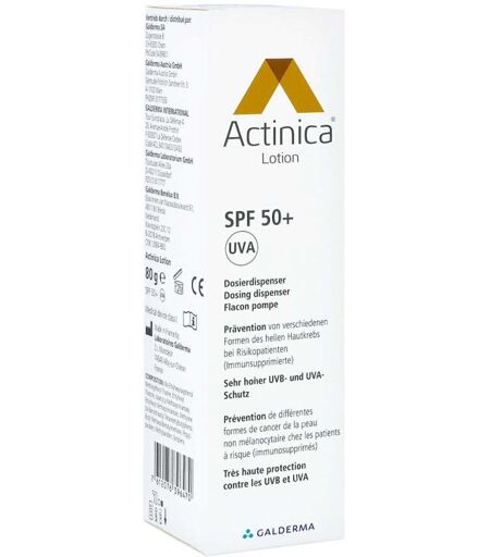 Aktinischer Keratosen gingen innerhalb von 2 Jahren nach regelmäßiger Anwendung von Actinica® Lotion um 53 % zurück. Es entstanden keine neuen invasiven Plattenepithelkarzinome innerhalb von 2 Jahren nach regelmäßiger Anwendung. Wirkungsweise von Actinica Lotion DispenserActinica Lotion Dispenser enthält eine Kombination aus modernen lichtbeständigen UV-Filtern, die ein breites Spektrum an UV-Strahlen absorbieren, reflektieren und streuen. Sie schützt die Haut hochwirksam sowohl vor UV-B- als auch vor UV-A-Strahlen. Es entspricht hinsichtlich UV-B- und UV-A-Strahlen der höchsten Kategorie „Sehr hoher UV-Schutz“.