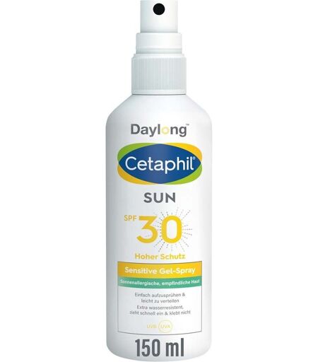 CETAPHIL Sun Daylong™ Sensitive Gel-Spray CETAPHIL Sun Daylong SPF 30 Sensitive Gel-Spray: Sonnenschutz für sonnenempfindliche, fettige Haut und schwer erreichbare Stellen. Gleich testen! CETAPHIL Sun Daylong™ SPF 30 Sensitive Gel Spray: Unkomplizierter Sonnenschutz für sonnenempfindliche Haut CETAPHIL Sun Daylong SPF 30 Sensitive Gel Spray ist ein besonders gut verträglicher Sonnenschutz für allergische, empfindliche und zu Sonnenallergie neigende Haut. Das extra leichte Gel-Spray ist besonders geeignet für schwer erreichbare Körperstellen, behaarte Hautpartien sowie aktive Sportler. Das Sonnenschutz-Spray ist extra leicht, zieht schnell ein und klebt nicht. Photostabile UV-Filter bieten hochwirksamen und sofortigen Sonnenschutz, effektiven Zellschutz1 und beugen sonnenbedingter Hautalterung vor.1 Es enthält weder Emulgatoren noch Fette, die in Kombination mit UVA-Strahlung die häufigsten Auslöser von Mallorca-Akne sind. Das Spray ist schweiß- und extra wasserresistent in Süß- und Salzwasser. CETAPHIL Sun Daylong™ SPF 30 Sensitive Gel-Spray: Vereint die Vorteile von Sonnengel und Sonnenspray Extra leichte, fettfreie Formulierung Sehr gut geeignet bei Sonnenallergie, Mallorca-Akne und zu Unreinheiten neigender Haut Ideal für schwer erreichbare oder behaarte Körperstellen sowie Sportler Zieht schnell ein, klebt nicht Schweiß- und extra wasserresistent in Süß- und Salzwasser Frei von Parfüm und Emulgatoren Sonnenschutz von der Nr. 1 Empfehlung von Dermatologen2 Für wen ist das CETAPHIL Sun Daylong™ Sensitive Gel-Spray geeignet? Die Formulierung des extra leichten, fett- und emulgatorfreien Sonnenschutz-Sprays verzichtet bewusst auf Parfüm und eignet sich insbesondere für Anwender mit zu Sonnenallergien, Mallorca-Akne und zu Unreinheiten neigender Haut. Der Sprühkopf ermöglicht ein unkompliziertes Auftragen des Sonnenschutzes - vor allem an schwer zu erreichenden Stellen sowie behaarten Körperpartien - und macht das Gel-Spray zum perfekten Begleiter. Auch für aktive Sportler und Menschen mit sonnenempfindlicher Haut. Anwendungstipps Tragen Sie das Sonnenschutz-Spray ca. 20 Minuten vor dem Sonnenbaden auf und lassen Sie es gut einziehen, um die optimale Schweiß- und Wasserresistenz zu erreichen. Verwenden Sie ausreichend Sonnenschutzmittel und sparen Sie keine Hautpartie aus. Vermeiden Sie zu geringe Auftragsmengen. Schweiß, sportliche Aktivitäten, Schwimmen und das anschließende Abtrocknen können den Schutzfilm reduzieren. Ein wiederholtes Auftragen des Sonnenschutz-Sprays über den Tag hinweg hilft den Sonnenschutz aufrechtzuerhalten. Meiden Sie zudem intensive Mittagssonne. Dreifach-Schutz vor schädlicher Sonnenstrahlung CETAPHIL Sun Daylong schützt vor verschiedenen Strahlungsarten: UVA-Strahlung lässt die Haut altern, fördert die Bildung von Falten sowie Altersflecken und kann allergische Lichtreaktionen hervorrufen. Zudem trägt UVA-Strahlung zur Entstehung von Hautkrebs bei. UVB-Strahlung verursacht Sonnenbrand sowie Schäden im Erbgut unserer... ...