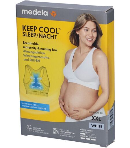 medela Keep Cool™ Schlaf-Bustier für Schwangerschaft und Stillzeit weiß, Gr. XXL Das Keep Cool™ Schlaf-Bustier von Medela verfügt über eine komplette Racerback-Atmungszone für frischere, kühlere Nächte und einen komfortablen, erholsamen Schlaf. Die innovative Quick Dry Technologie hilft Ihnen, Ihre Körpertemperatur zu regulieren. Die 4-way Adaptive Stretch™-Technologie sorgt dafür, dass Ihr BH mitwächst und von der Schwangerschaft bis zur Stillzeit getragen werden kann – für besten Komfort beim Liegen und Schlafen. Keine Haken und eine Atmungszone zwischen den Schulterblättern sorgen für zusätzlichen Komfort beim Schlafen Überkreuztes Design für einfaches Stillen Schnelltrocknende Technologie, einzigartige Atmungszonen und Temperaturregulierung sorgen dafür, dass Sie sich kühl und trocken fühlen Soft Touch Adaptive Stretch™-Technologie für eine perfekte Passform, die mit Ihrem sich verändernden Körper mitwächst Sanfter Halt für mehr Komfort Erhältlich in Schwarz, Chai oder Weiß*und in den Größen S–L für starken Halt und eine perfekte Passform Dieses bügellose & nahtlose Schlaf-Bustier im Racerback-Design verleiht Ihnen ein weiches Tragegefühl und schmiegt sich federleicht an eine der empfindlichsten Stellen Ihres Körpers an. Hinweise Hergestellt aus 95 % Nylon und 5 % Spandex Maschinenwäsche bei bis zu 60 °C Nur Schonwaschgang Bei Bedarf chlorfreie Bleiche Hängend trocknen, nicht bügeln, nicht chemisch reinigen Vor dem Tragen waschen Mit ähnlichen Farben waschen ...