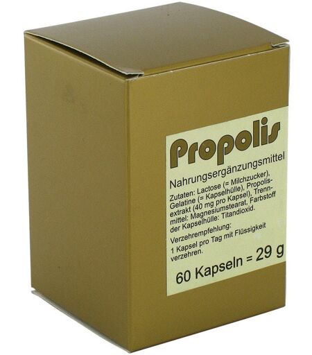 Anwendungsgebiet von Propolis KapselnNahrungsergänzungsmittelWirkstoffe / Inhaltsstoffe / ZutatenLactose (= Milchzucker), Gelatine (= Kapselhülle), Propolisextrakt (40 mg pro Kapsel), Trennmittel: Magnesiumstearat.GegenanzeigenBei bekannter Überempfindlichkeit gegenüber einem der oben genannten Inhaltsstoffe sollte dieses Produkt nicht angewendet werden.Dosierung1 Kapsel pro Tag mit Flüssigkeit verzehren.HinweiseDie empfohlene tägliche Verzehrmenge darf nicht überschritten werden. Nahrungsergänzungsmittel sind kein Ersatz für eine gesunde und ausgewogene Ernährung und sollten außerhalb der Reichweite von Kindern aufbewahrt werden. Propolis Kapseln können in Ihrer Versandapotheke www.juvalis.de erworben werden. ...