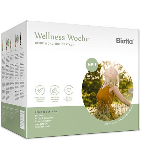 Bitte achten Sie auf eine abwechslungsreiche und ausgewogene Ernährung und gesunde Lebensweise.Biotta® Meine Wellness WocheBiotta Wellness Woche beinhaltet alles, was für eine Woche Saftfasten benötigt wird. Saftfasten regt die Entgiftung des Körpers an, reguliert den Appetit und fördert die Fettverbrennung. Schaffen Sie sich mit der Wellness Woche eine persönliche Auszeit für einen Neustart; weg von hektischem ungesundem Essen.Neu mit Rezepten für vor und nach der Saftwoche, basischem Badesalz und exklusiven Yoga-Tutorials. Online-Community mit Forum & Newsletter. Biotta produziert seit über 60 Jahren frisch gepresste Säfte in höchster Bio-Qualität am Ufer des wunderschönen Bodensees in der Schweiz. Der Schweizer Bio-Pionier verzichtet seit jeher auf den Einsatz von Konzentraten und die Zugabe von künstlichen Zusatzstoffen oder Zucker. Inhalt: 11 Frucht- und Gemüse-Direktsäfte (5dl): Biotta Mein Safttag #1 (3x), Biotta Mein Safttag #2 (2x), Biotta Vita 7 (2x), Biotta Tomate (2x), Biotta Vital Digest 2x) 1 Packung Bio-Leinsamen (100 g) 1 Packung Biotta Bio-Kräutertee (75 g) (Mischung aus acht Bio-Kräutern) 1 Packung Basisches Badesalz (120 g) Anleitung inkl. Rezepten und zahlreichen Tipps & Tricks für 1 Vorbereitungstag, 5 Safttage, 2 AufbautageZutaten: Mein Safttag #1Apfelsaft*, Mangopüree* (19%), Verveine-Auszug* (19%), Orangensaft*, gelber Karottensaft* (15%), Gurkensaft milchsauer vergoren* (10%), Zitronensaft*, Kurkuma*, Pfeffer*. Pasteurisiert. *aus biologischem AnbauMein Safttag #2 Karottensaft* (71%) (CH), Gurkensaft milchsauer vergoren* (8%), Tomatensaft*, Apfelsaft* (6%), Bananenpüree*, Akazienfasern* (3%), Zitronensaftkonzentrat*, Stabilisator: Pektin, Ingwersaft*, Zitronensaft*, Zimt*. Pasteurisiert. *aus biologischem Anbau Biotta Vita 7 Orangensaft* (34%), Apfelsaft*, Karottensaft* (15%), Bananenpüree* (14%), Traubensaft* (11%), Ananassaft* (10%), Acerolapüree*, Zitronensaftkonzentrat*. Pasteurisiert. *aus biologischem Anbau Biotta Tomate Tomatensaft* (Italien), Zitronensaft* (1%), Meersalz (0.5%). Pasteurisiert. *aus biologischem AnbauBiotta Vital Digest Pflaumensaft*, Dörrpflaumenpüree* (35%) (Wasser, Dörrpflaumen), Traubensaft*, Aprikosenpüree* (5%), Aroniasaft*, Zitronensaft*. Pasteurisiert. *aus biologischem AnbauBiotta Bio Kräutertee Fenchel*, Lindenblüten*, Hagenbuttenschalen*, Kamille*, Pfefferminze*, Zitronengras*, Zitronenverbene*, Ringelblumenblüten*.Biotta Bio LeinsamenLeinsamen* (Linum usitatissimum L.)Vita Base® Badesalz SODIUM BICARBONATE, SODIUM CHLORIDE, MAGNESIUM CHLORIDE. Nährwertangaben:Biotta Mein Safttag #1 Energie 140 kJ (32 kcal) Fett 0 g davon ges. Fettsäuren 0 g Kohlenhydrate 8 g davon Zucker 7 g Eiweiß 0,3 g Salz 0,03 g Biotta Mein Safttag #2 Energie 130 kJ (31 kcal) Fett 0 g davon ges. Fettsäuren 0 g Kohlenhydrate 5,8 g davon Zucker 5,6 g Eiweiß 0,5 g Salz 0,1 g Kalium 262mg (13% NRV) Biotta Vita 7 Energie 230 kJ (54 kcal) Fett 0 g davon ges. Fettsäuren 0 g Kohlenhydrate 13 g davon Zucker 12 g... ...