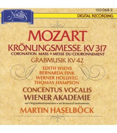 Binding : Audio CD, Label : Novalis (in-akustik), Publisher : Novalis (in-akustik), NumberOfDiscs : 1, medium : Audio CD, releaseDate : 1990-01-01, artists : Wiens, Hollweg, Haselböck, composers : Wolfgang Amadeus Mozart ...