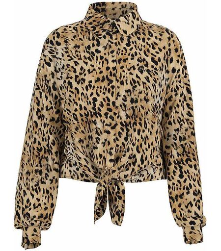 Damen Bluse aus glattem Material Hemdblusenkragen Knopfleiste Langarm Manschetten Tonales Logo Vorne zum Binden Reguläre Passform Farbbezeichnung: Cheetah Skin Prin Material: 100% Polyester ...