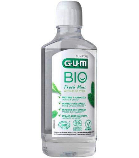 Anwendungsgebiet von GUM BIO MundspülungGUM BIO Mundspülung ist die natürliche Lösung zum Schutz der Zähne. Das zertifizierte Bio-Produkt ist mit seinen 99% natürlichen Inhaltsstoffen und 12% aus kontrolliert biologischem Anbau die besonders sanfte Alternative für Zahnfleisch und Zähne. Wirkungsweise von GUM BIO MundspülungDie GUM BIO Mundspülung enthält Fluorid (gemäß den Empfehlungen von Zahnärzten und der Europäischen Föderation für Parodontologie) zur Stärkung von Zahnschmelz und zum Schutz vor Karies. Zusätzlich beinhaltet die Mundspülung Bio-Aloe Vera und Bio-Kamille, um das Zahnfleisch zu beruhigen. Die Bio-Pfefferminze sorgt für einen frischen Atem.